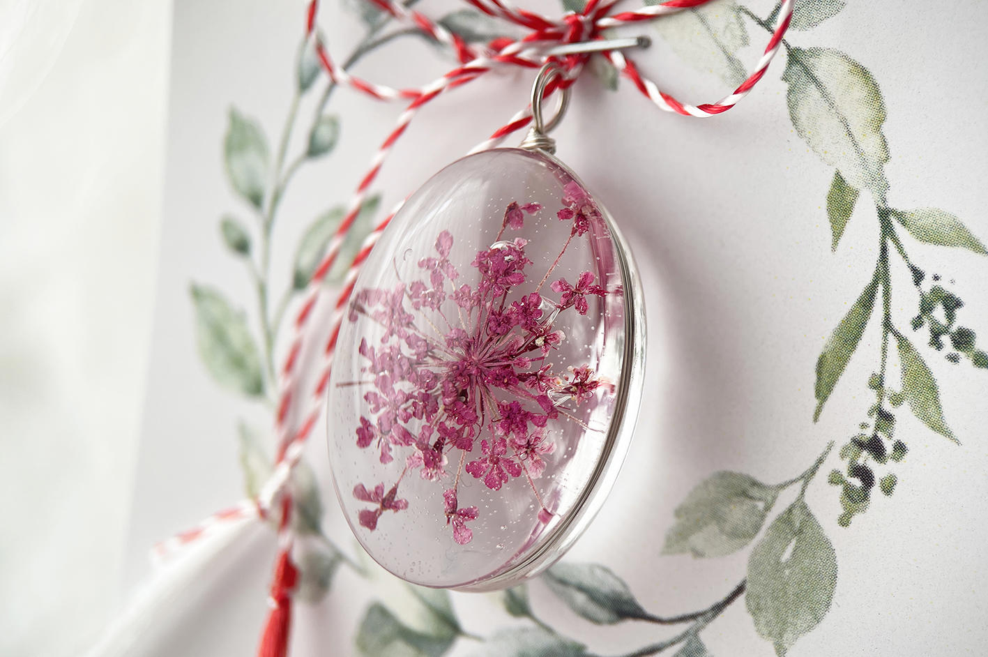 Este realizat manual cu floare naturala, sticla, rasina si argint 925.