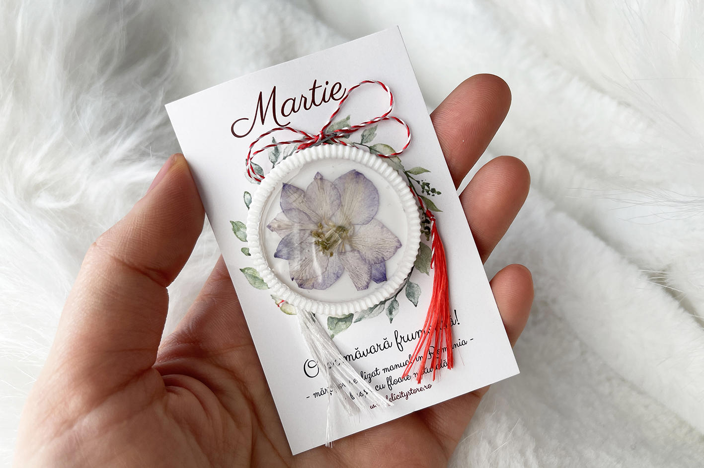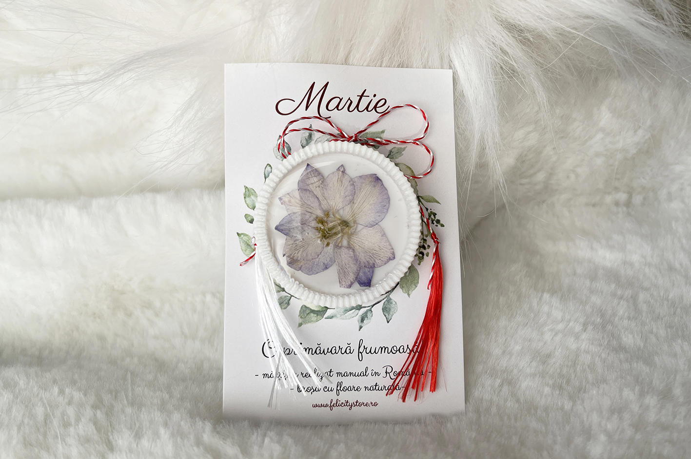 Brosa vine atasata pe cartonas, exact ca cel din imagine, la care se adauga plicul cu inchidere origami. Fotografia principala a martisorului este cu titlu de prezentare.