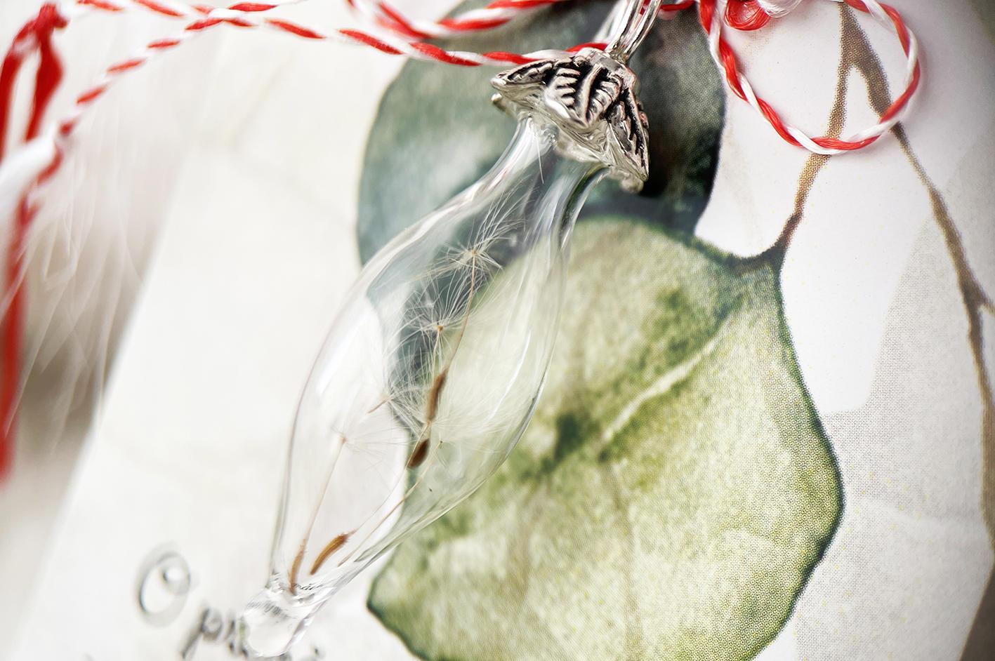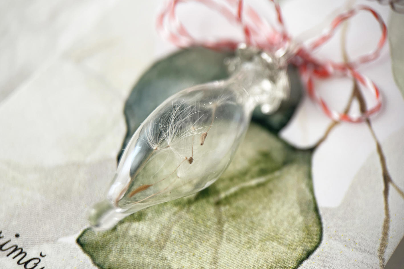 Pandantivul este realizat din sticla de calitate, puf natural de papadie si material placat cu argint.